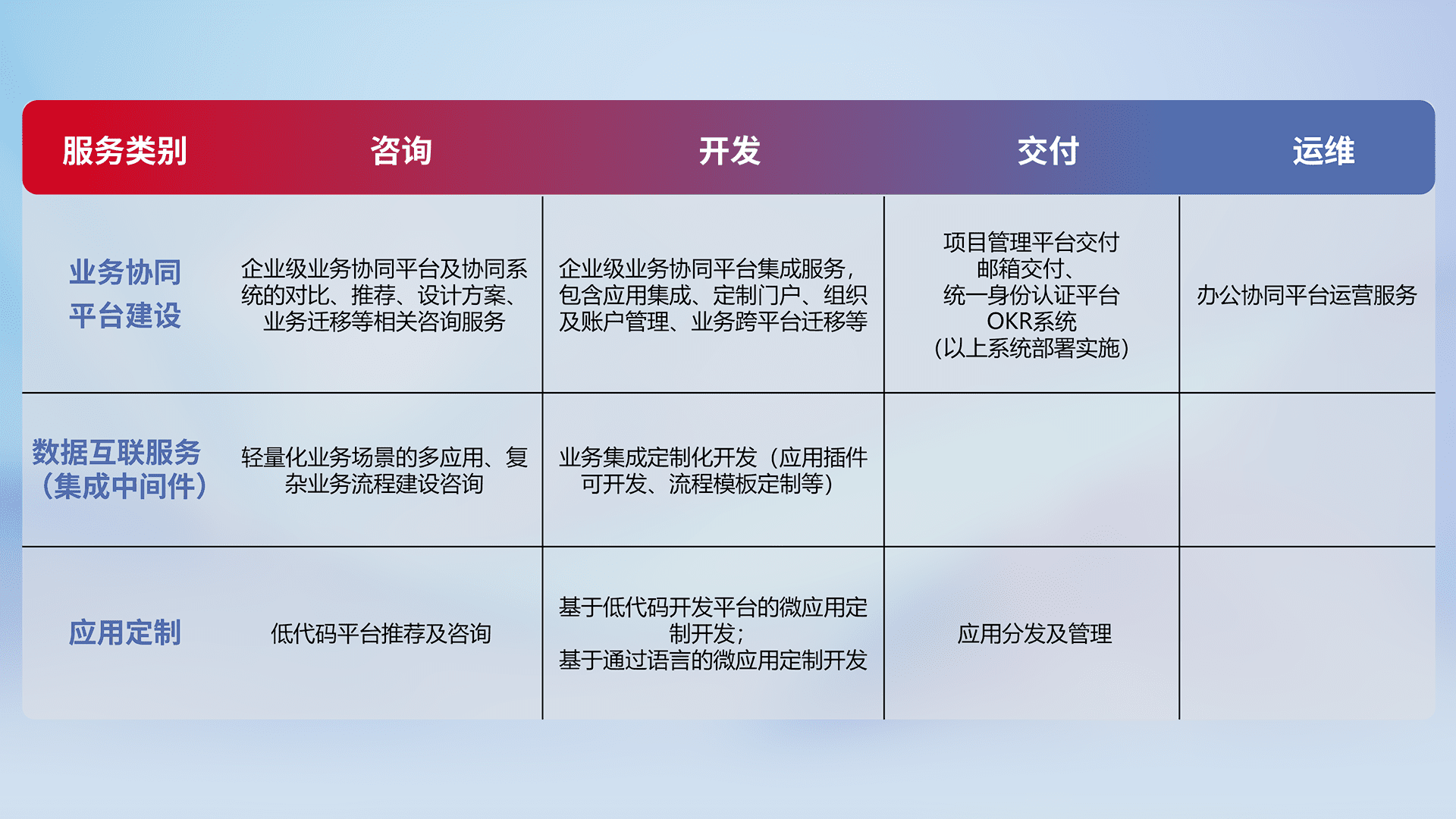 针对钉钉、、、、企微、、、、IDaas等平台级产品提供产品的规划、、方案、、、、交付、、、、定制化开发等服务,,,实现如统一协同办公、、、、智能客户服务、、、、混合会议管理、、、、智能数据查询、、等业务场景,,,,实现数字化转型。。