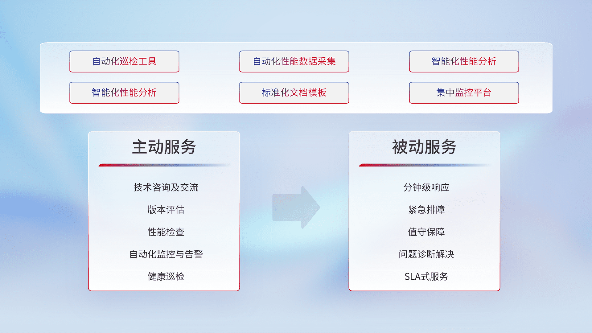 智能化工具和标准化文档,,,保障服务质量,,,提供主动服务(包含技术咨询、、、、版本评估、、性能检查、、自动化监控与告警、、健康巡检)和被动服务包含(分钟级响应、、、、紧急排障、、值守保障、、、问题诊断解决、、SLA服务)。。。