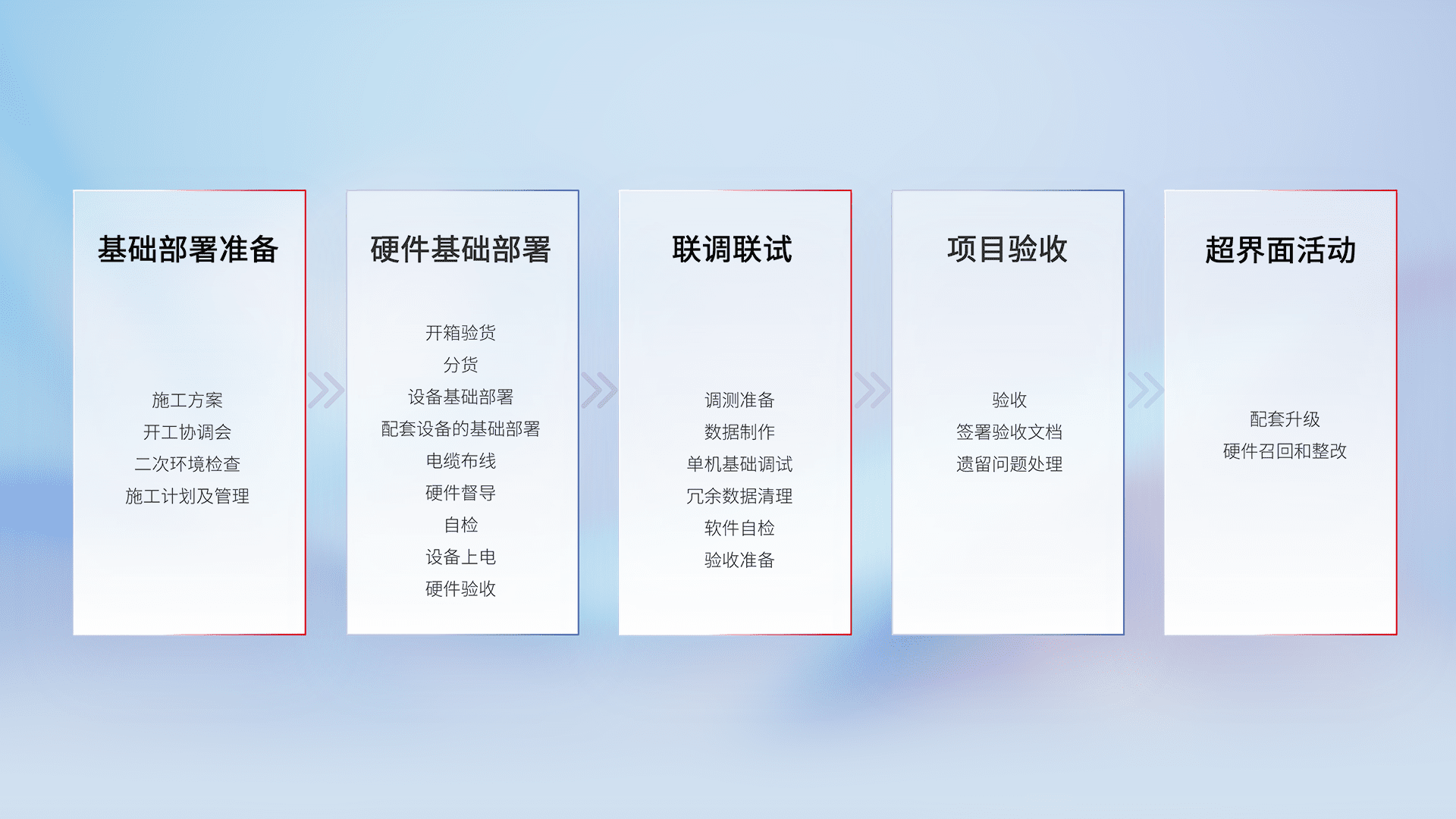 从基础部署准备、、硬件基础部署、、、、联调联试、、项目验收、、、越界面活动的全过程可追溯,,,保证施工质量和进度。。。